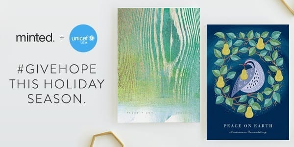 Minted has partnered with UNICEF USA with a collection of holiday cards inspired by their #GiveHope campaign. Besides being gorgeous 20% of the purchase from the collection will support UNICEF’s goal of putting children first in 190 countries and territories. Your purchase can give education, nutrition, health, water, relief, joy or a voice to children the world over.