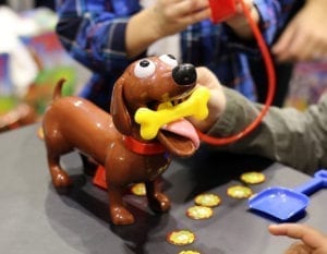This charming dachshund captivated kids (and adults) alike at the Chicago Game and Toy Fair, and Jennifer, a dachshund-lover herself, could relate. This toy aims is to “model responsibility” in wee pet owners (no pun intended), by creating a game about canine input and output. Basically, the dog gets fed and the leash is squeezed, leaving behind pellets. If playing the game, the player who cleans up the most “pellets” wins. We found that this dog was a great “stand alone” toy even when the game wasn’t being played. Kids easily gravitated to the idea of caring for, feeding and “walking” this adorable dog, as well as attending to the resulting bodily functions. This toy is designed for children age four and older.